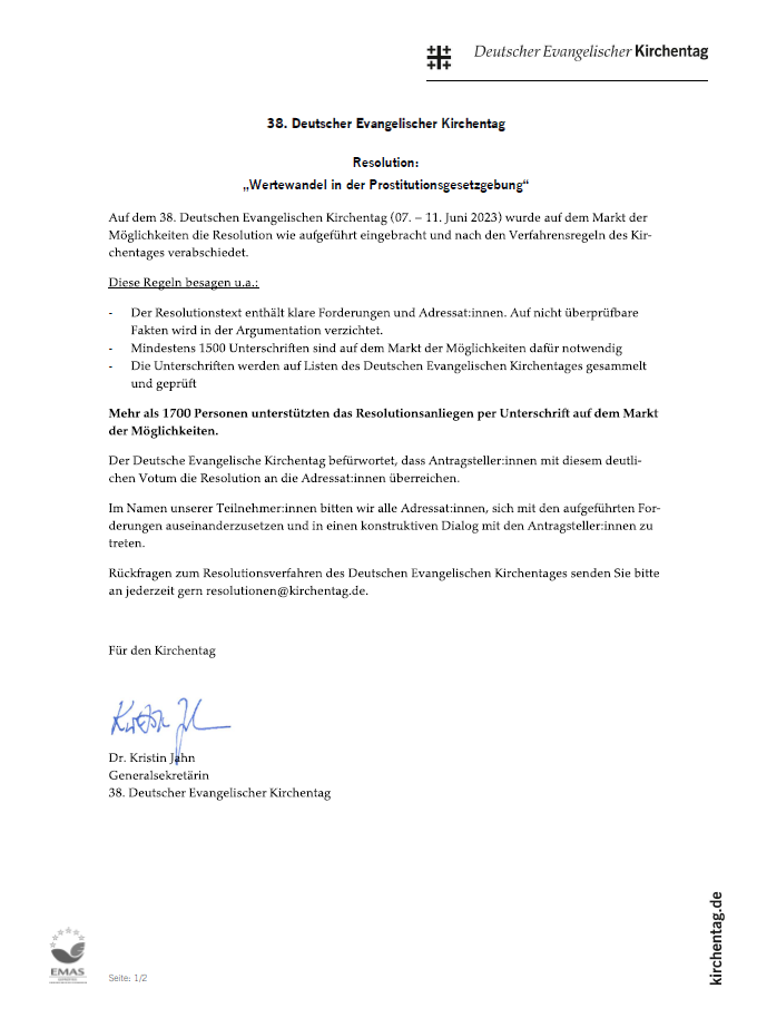 Im März 2006 – kurz vor der Fußball-Weltmeisterschaft der Herren in Deutschland - wies das Europäische Parlament auf die Problematik der zunehmenden Nachfrage nach Prostitution während Sportgroßveranstaltungen hin. Darin wird die Notwenigkeit festgestellt, die Nachfrage der Freier durch Sensibilisierung zu reduzieren. Dem kommen wir mit unserer Kampagne #RoteKartefürFreier – für eine EM ohne Sexkauf nach.