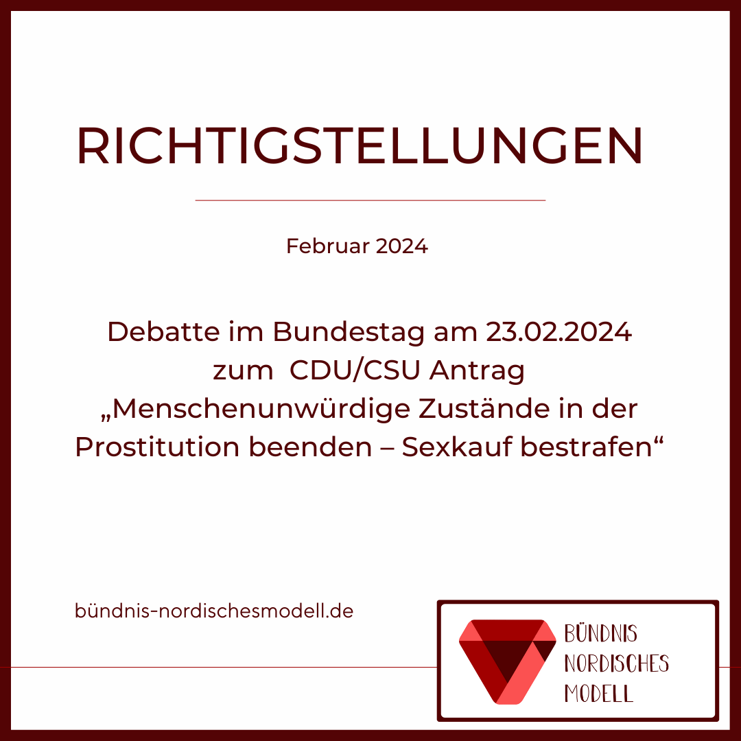 Am 23.02.2024 fand zu dem CDU/CSU-Antrag „Menschenunwürdige Zustände in der Prostitution beenden – Sexkauf bestrafen“ eine Bundestagsdebatte statt. An der Debatte beteiligten sich außer BSW die Fraktionen CDU/CSU, die SPD, die Bündnis ´90/Die Grünen, die FPD und die AfD mit Redebeiträgen.